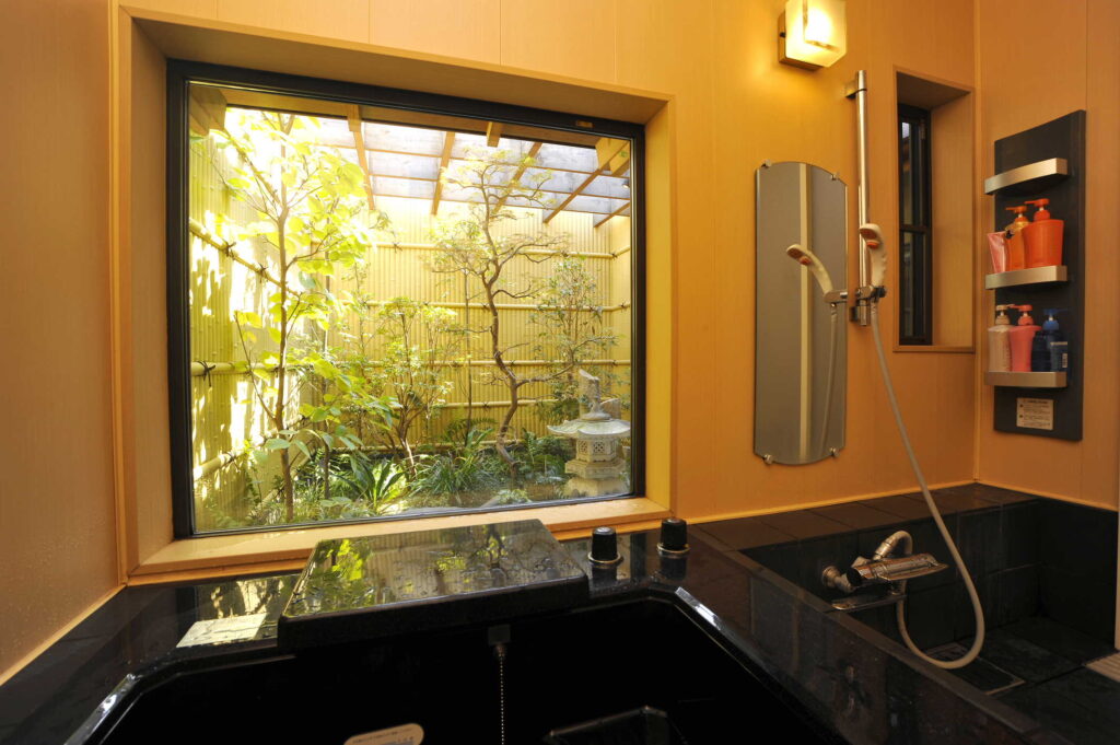 窓を設けて坪庭を眺められるようにすれば、入浴中に四季折々の景色を感じながらリラックスできます。