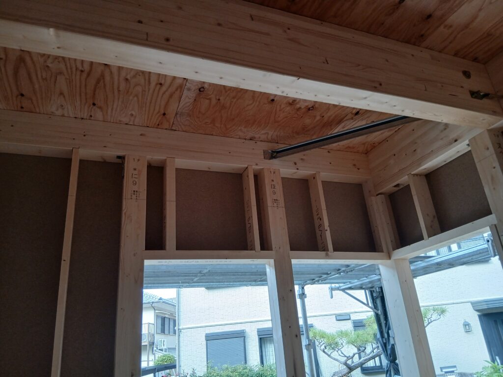 構造用合板のほかに、火打ち金物を設置しているのが見えます。
