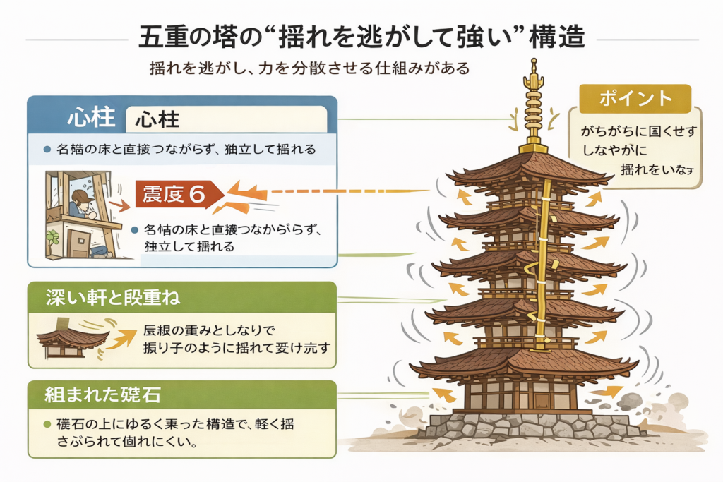 昔の五重の塔が、今でも地震に耐えて残ってるのがその証し。